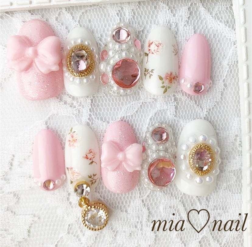 ゆめかわいい〜大人可愛いピンクと花柄のビジューネイル