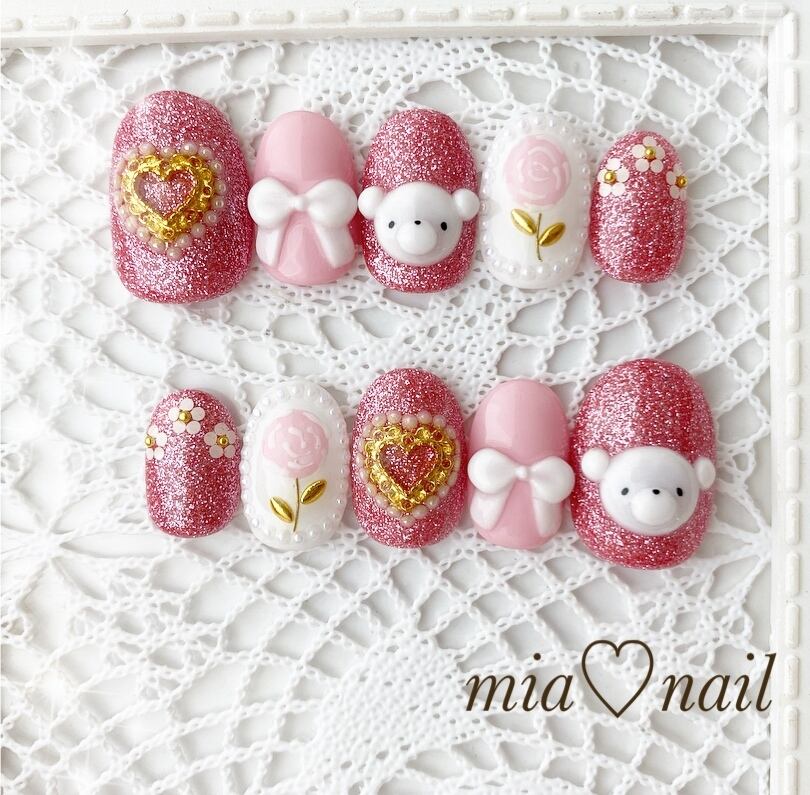 クマさん×ピンクラメネイル
