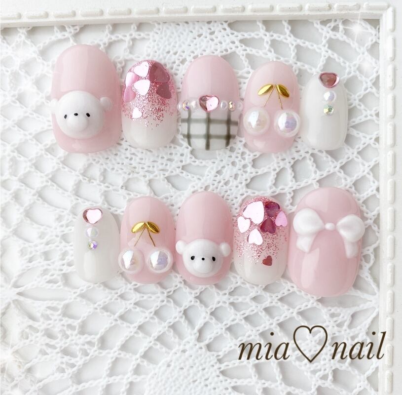 ゆめかわいい〜チェックとクマさんのキラキラハートネイル