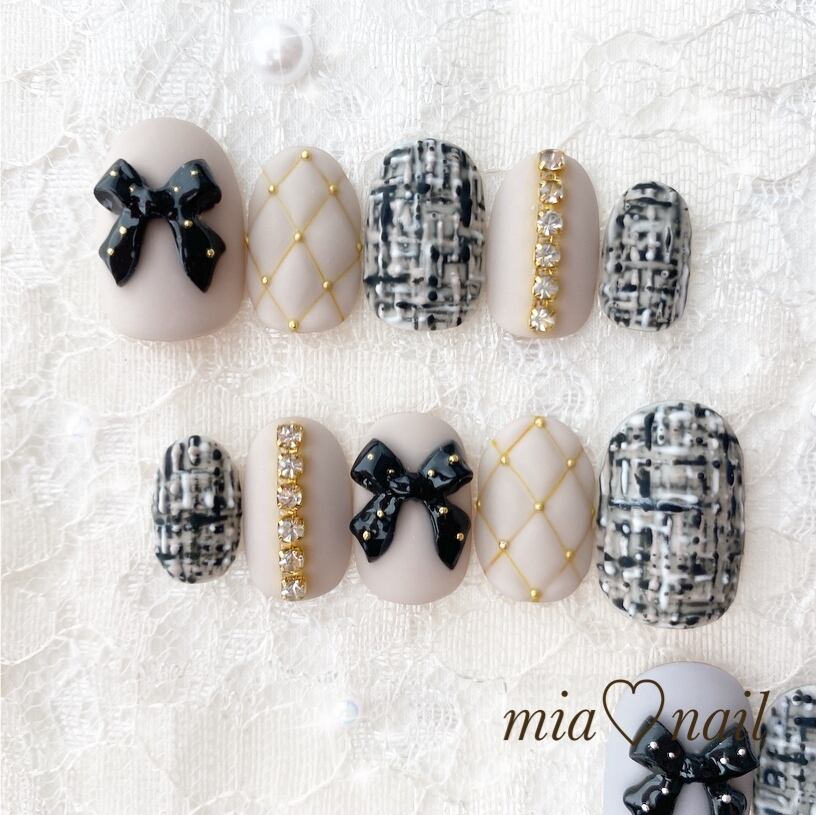 リボン×ツイードの可愛いキルティングマットネイル(ベージュ)