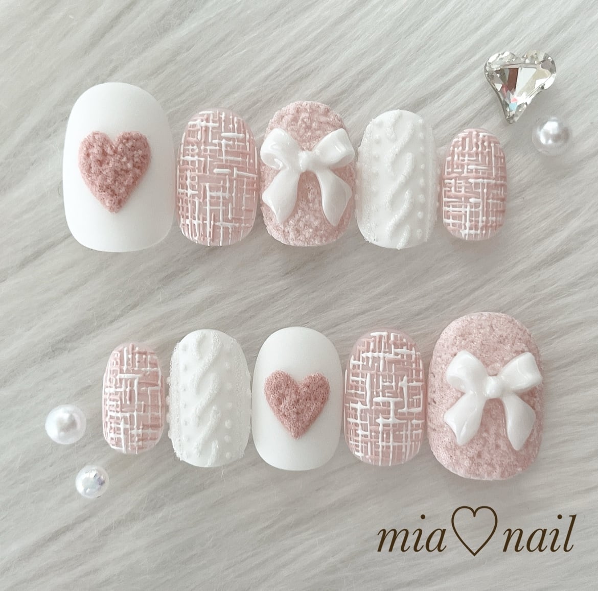 もこもこハートとリボンの可愛いツイードネイル(ピンク)