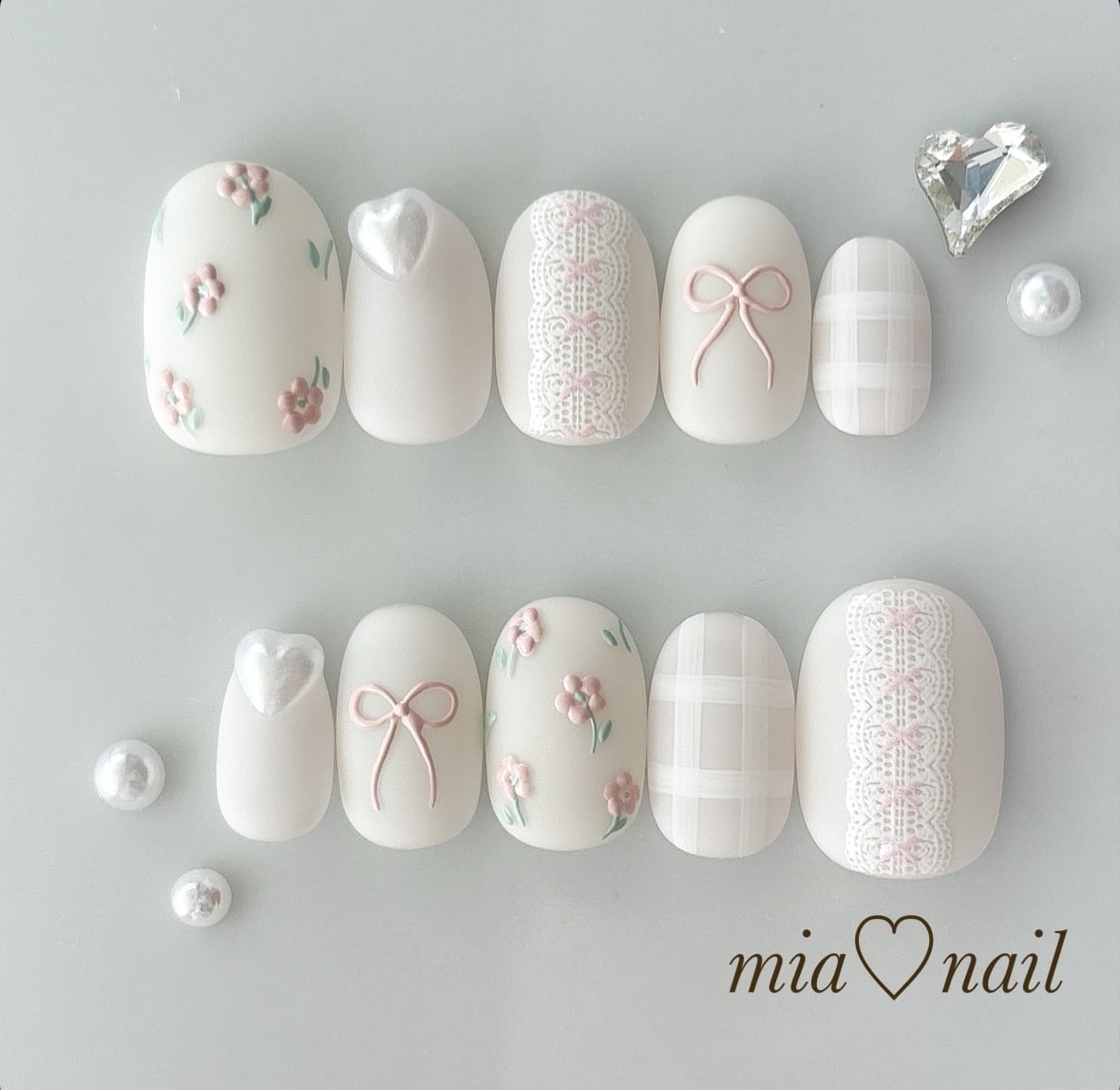 お花とふりふりリボンの可愛いガーリーマットネイル