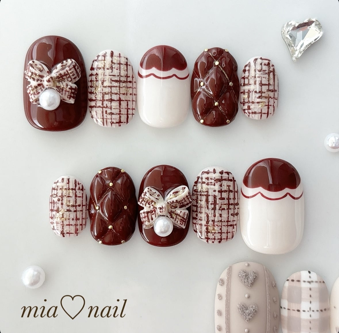 ワインレッドカラーとリボンの可愛いツイードネイル