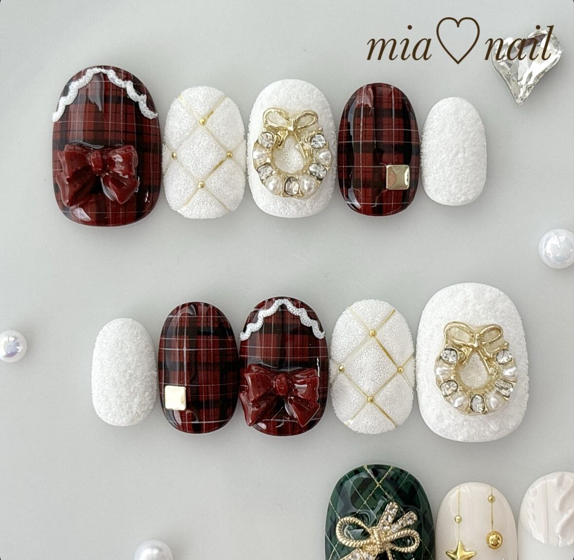 ギンガムチェックとワインレッドの可愛いクリスマスネイル